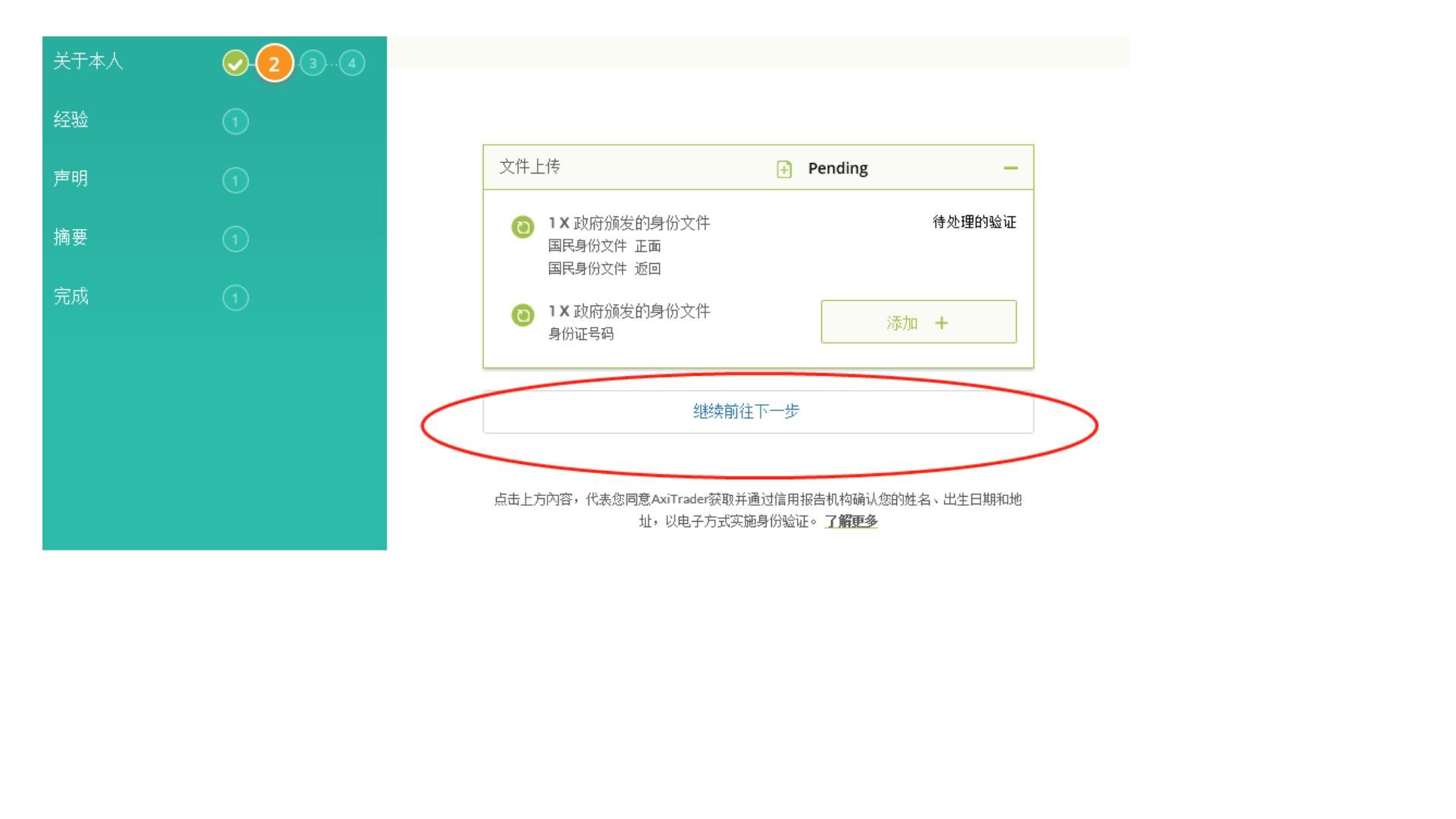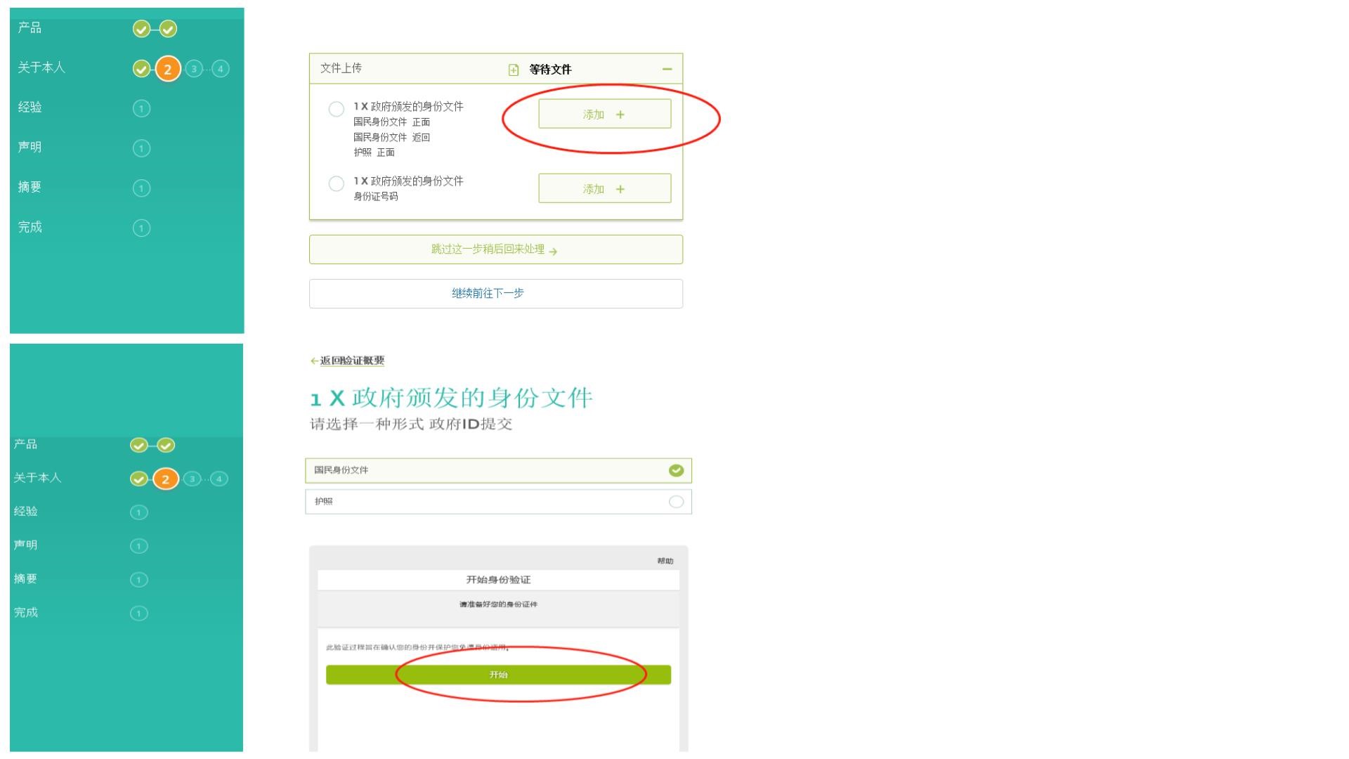 验证身份证这里点击第一个"添加",然后选择"国民身份文件",再点击"开始"上传身份证正反面照片。